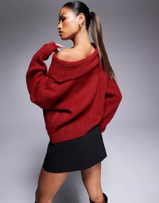ASOS DESIGN oversized knitted off shoulder jumper in wine Very well made.